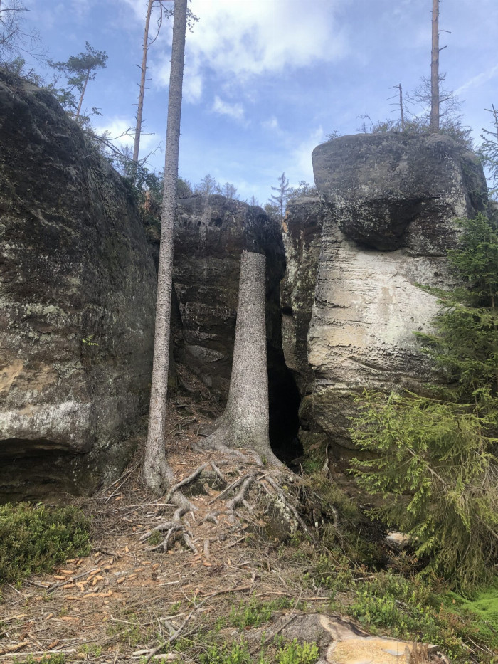 Jako parta kamarádů, kteří tam spolu kuchtí a krájeli právě před chvílí cibuli. Z kmenů jim tekly gejzíry bílé smůly. A vypadalo to tak, že slzí. Dneska už tam bohužel ty stromy nestojí, zničil je kůrovec a lesníci je vykáceli.